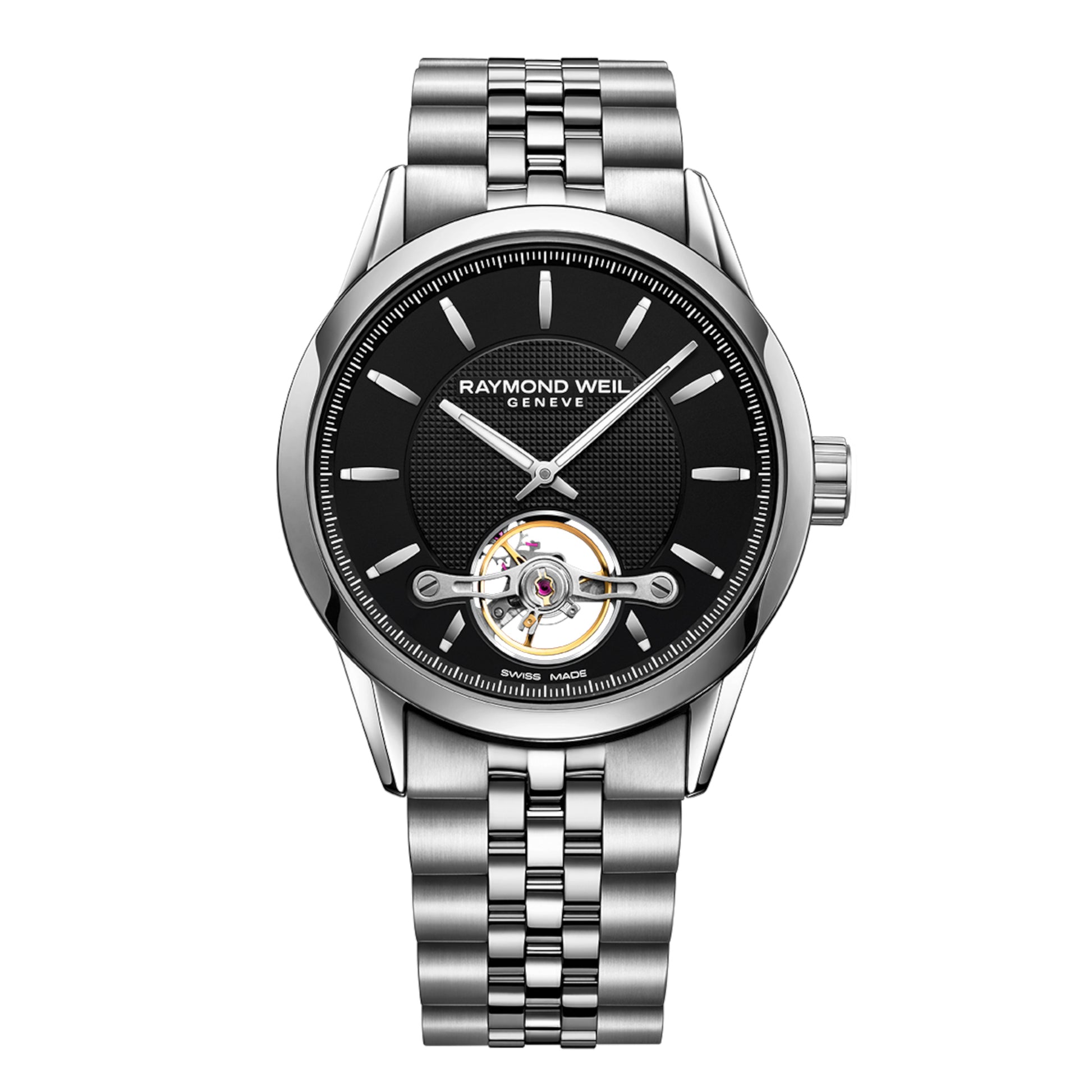 RAYMOND WEIL präsentiert ein Modell, das alles andere als gewöhnlich ist: Das durchbrochen gearbeitete Zifferblatt gewährt auf der Sechs-Uhr-Position freien Blick auf den Uhrenmechanismus. Die einbrückige Konstruktion, in der Unruh und Federhaus gelagert sind, ist einem wunderbaren Tourbillon nachempfunden. Die Schwungmasse ist mit dem Muster „Côtes de Genève“ verziert und mit dem Logo von RAYMOND WEIL graviert. Das wunderbare Uhrwerk ist auf einem Teil des Zifferblatts sichtbar und zieht garantiert neugierige Blicke an. Die Bauteile auf der Werkplatte und die symmetrisch angeordnete Brücke unterstreichen das ausbalancierte Design dieses durch und durch eleganten Uhrenmodells. Das minimalistische Design der Freelancer vom Kaliber RW1212 wird durch zwei Zeiger vollendet, die Stunde und Minute präzise anzeigen.