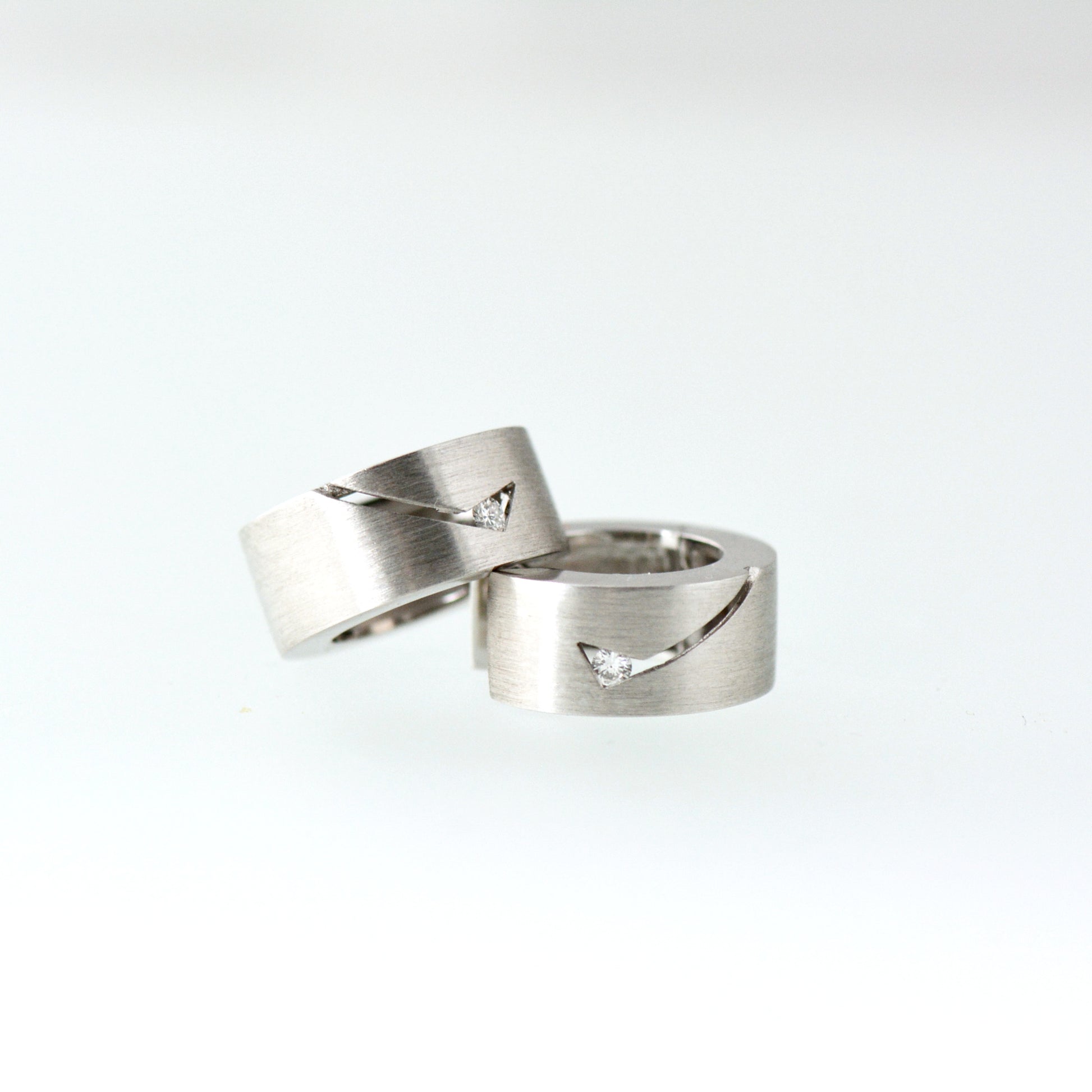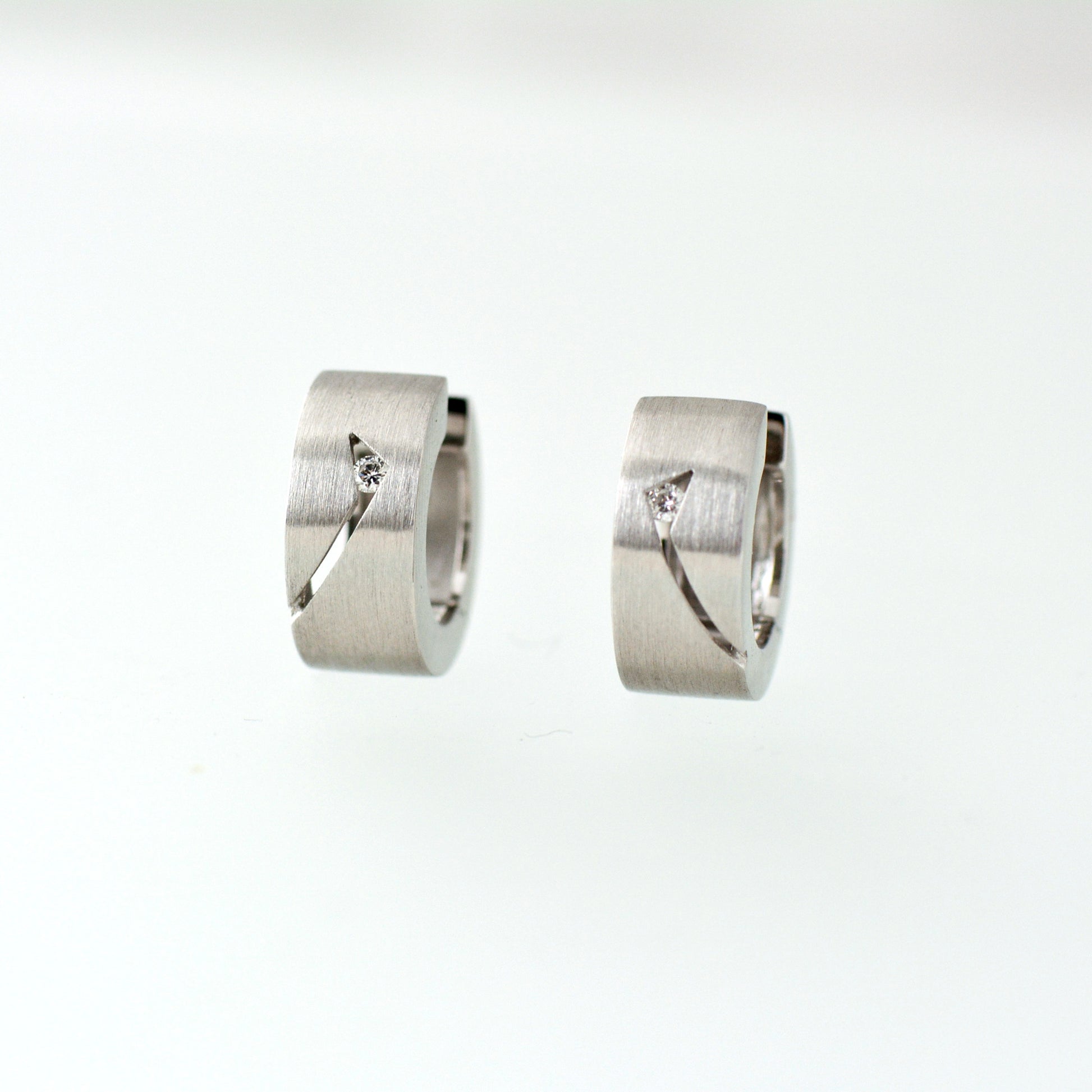 Sehr solide, in Weißgold gefertigte Creolen mit Scharnierpatent. Der Brillant sitzt in einer Kanalfassung und schließt bündig mit der Oberfläche des Ohrringes ab. Das gebürstete Finish der Creole verleiht ihr außergewöhnliche Eleganz. Gesamtgewicht der Brillanten 0,07 ct.