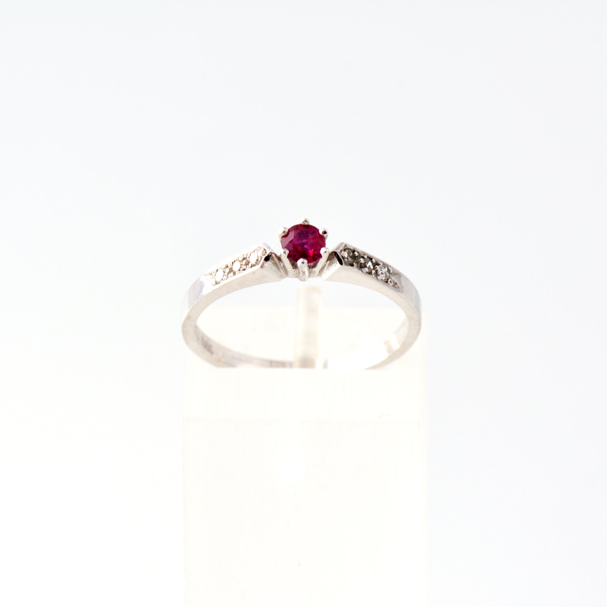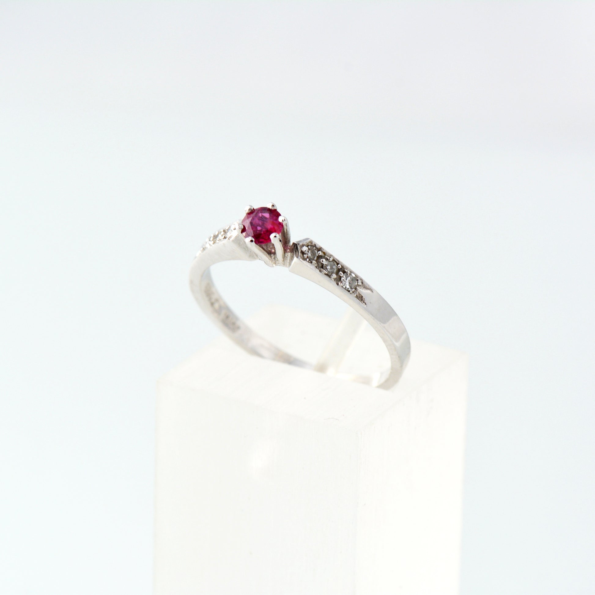 Zarter Damenring in Weißgold mit Rubin und kleinen Brillanten, jeweils 3 beiderseits des Mittelsteines. Der Rubin mit seiner sanft roten Farbe ist mit Krappen gefasst. Die schmale aber kompakte Ringschiene lässt dieses Stück auch als Vorsteckring, in Kombination mit dem Ehering, gut aussehen.