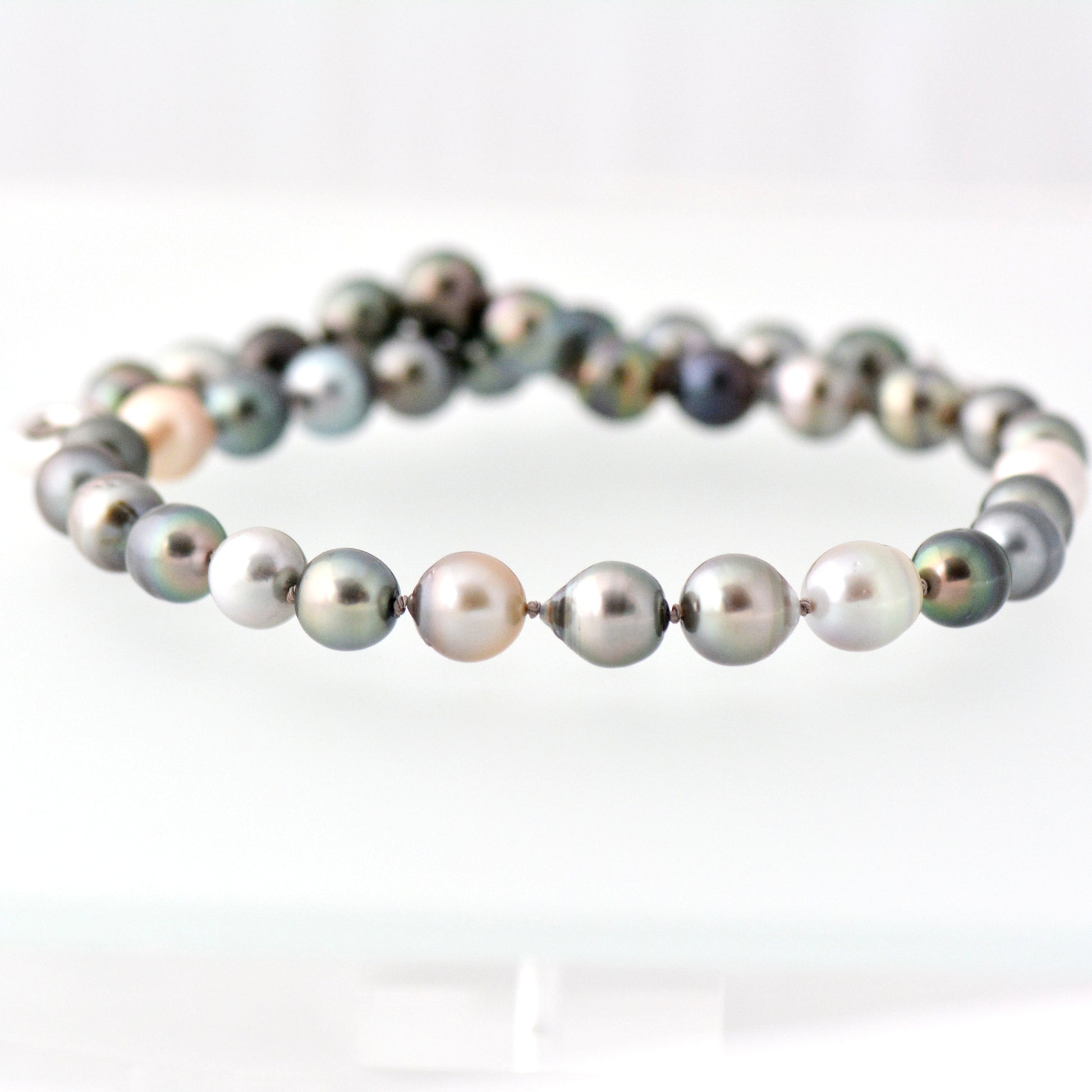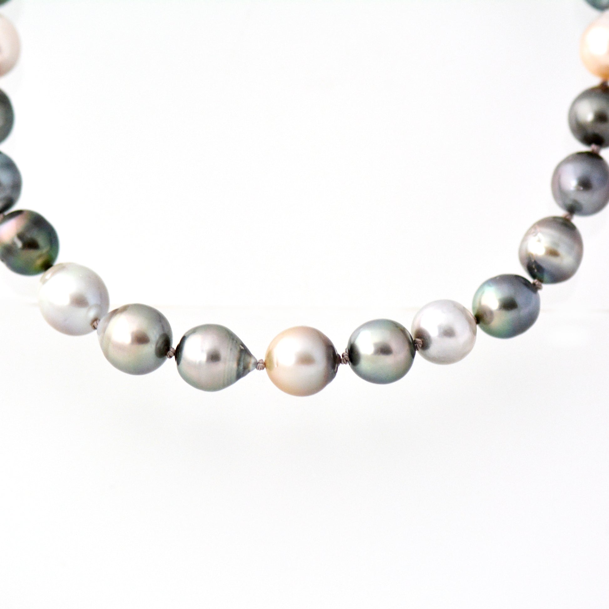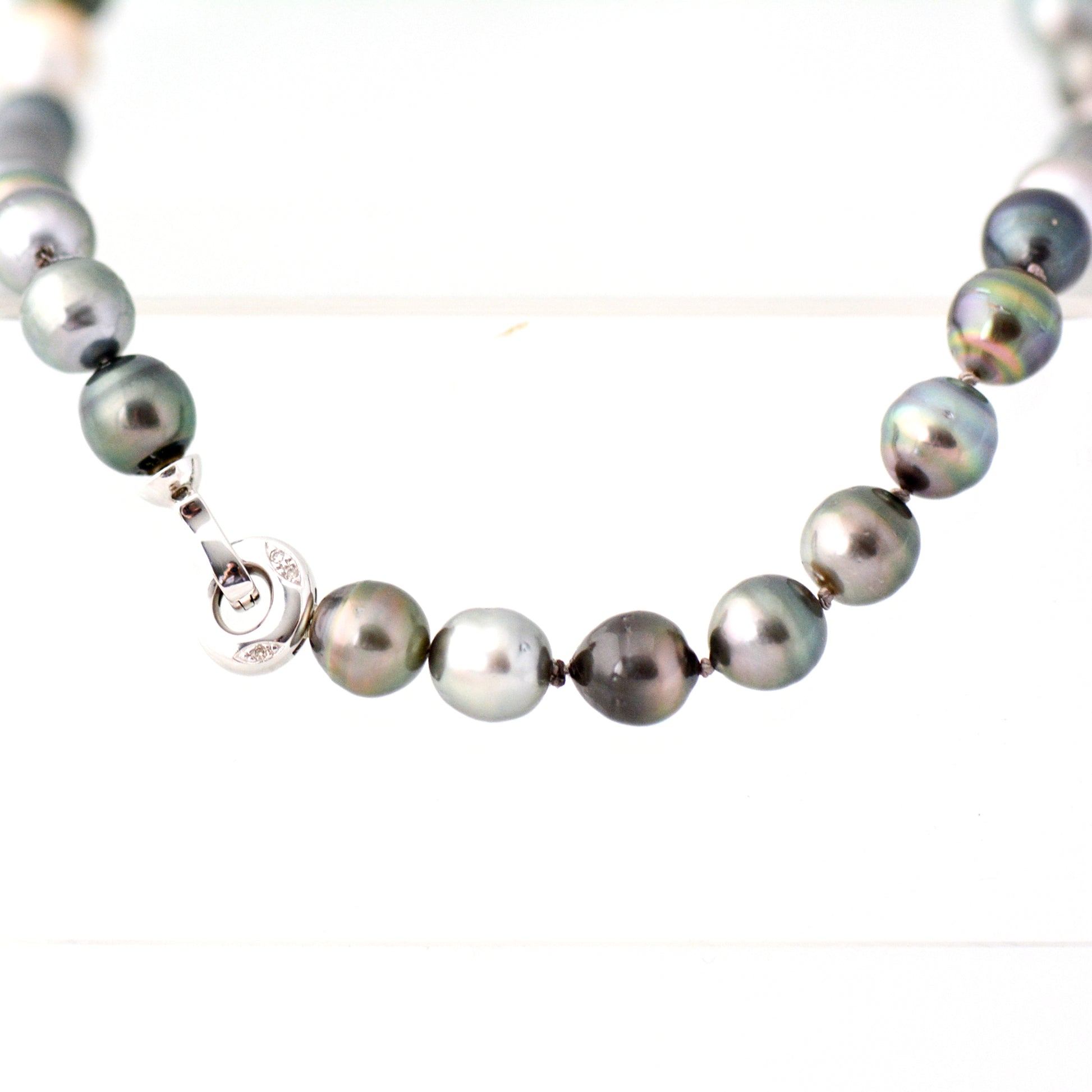 Necklace made of Tahitian pearls, vividly mixed pearls from dark gray to silvery grey. The chain is knotted slightly running, pearl size from 10.5 - 12 mm. Solid, easy-to-handle white gold clasp decorated with small diamonds (0.137 ct).