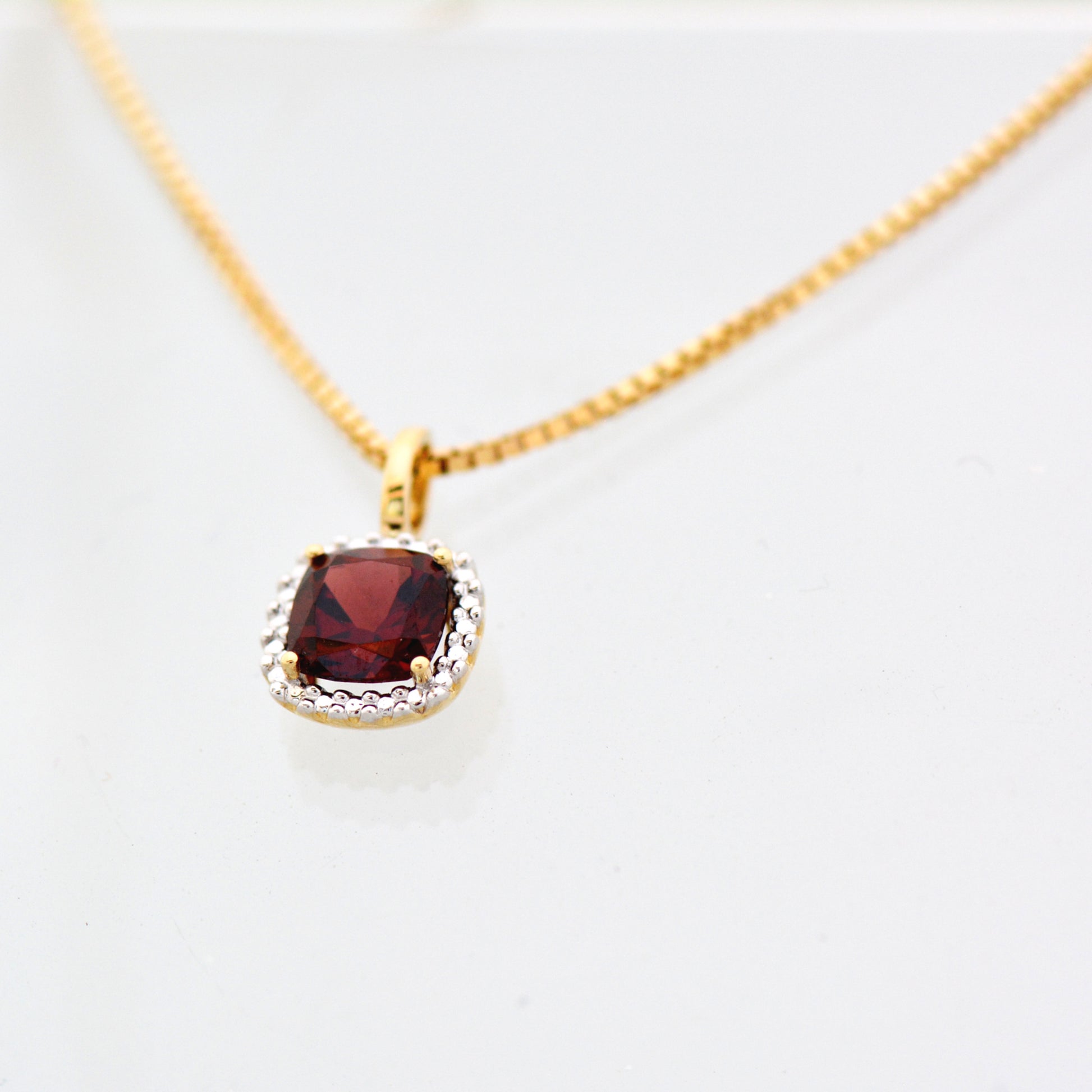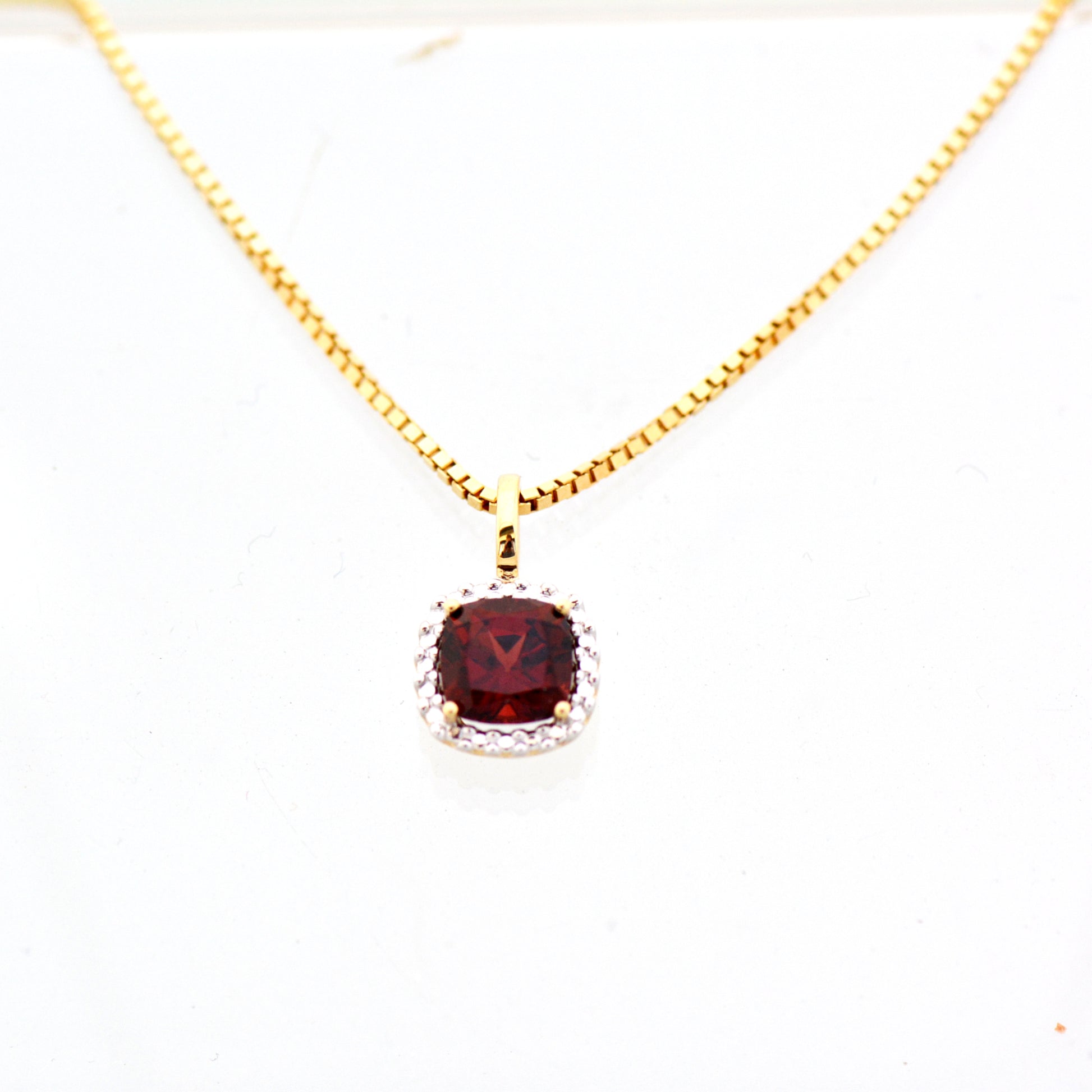 Beautifully adorned. With this delicate garnet pendant, the center stone framed in a rosette-like, white gold plating.